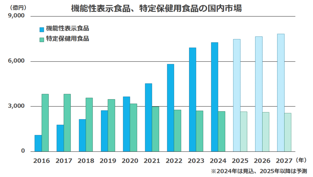 株式会社富士経済の調査によると、機能性表示食品の市場規模は7,274 億円(5.2%増)。「睡眠ブームの落ち着きやサプリメントの苦戦で伸びは鈍化」とされています。