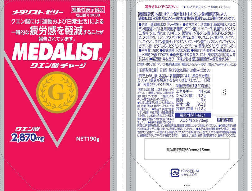 | 表示しようとする機能性 | 本品にはクエン酸が含まれます。クエン酸は日常生活における軽い運動後の一時的な疲労感を軽減することが報告されています。 |