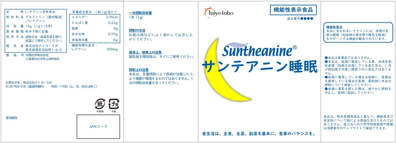| 表示しようとする機能性 | 本品には「L-テアニン」が含まれます。「L-テアニン」には、夜間の良質な睡眠(起床時の疲労感や眠気を軽減)をサポートすることが報告されています。 |