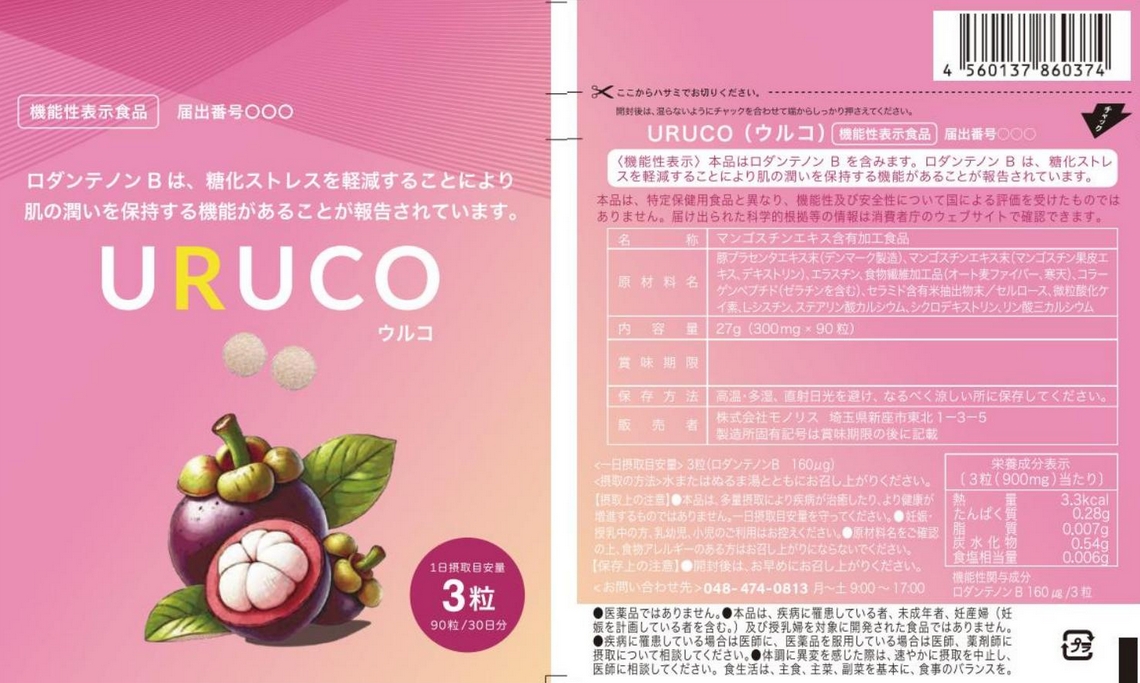 | 表示しようとする機能性 | 本品はロダンテノンBを含みます。ロダンテノンBは、糖化ストレスを軽減することにより肌の潤いを保持する機能が報告されています。 |