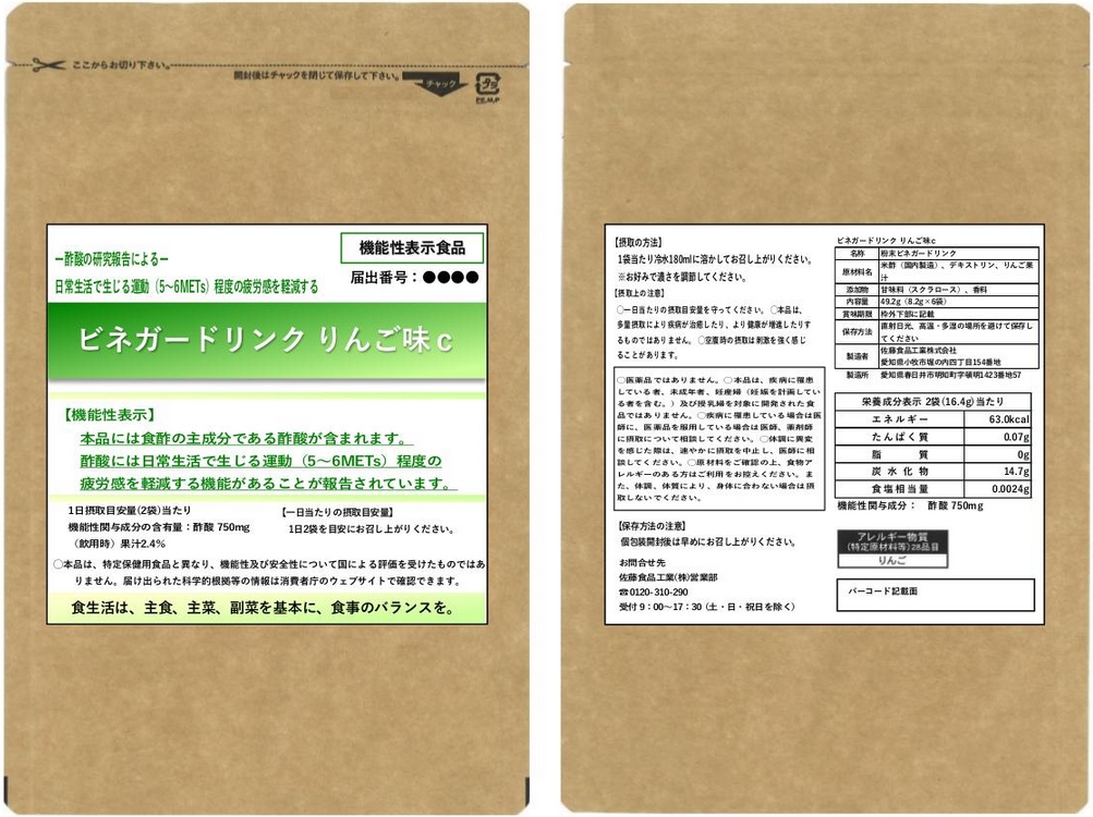 | 表示しようとする機能性 | 本品には食酢の主成分である酢酸が含まれます。酢酸には肥満気味の方の内臓脂肪を減少させる機能があることが報告されています。内臓脂肪が気になる方に適した食品です。 |