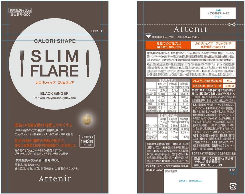 | 表示しようとする機能性 | 本品には、ブラックジンジャー由来ポリメトキシフラボンが含まれます。ブラックジンジャー由来ポリメトキシフラボンは、日常活動時のエネルギー代謝において脂肪を消費しやすくする作用により、BMIが高め(BMI24以上30未満)の方のおなかの脂肪(内臓脂肪、皮下脂肪)を減らすのを助ける機能があることが報告されています。 |