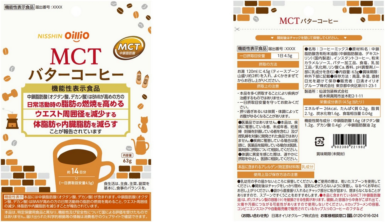 | 機能性関与成分名 | 中鎖脂肪酸(オクタン酸、デカン酸) |