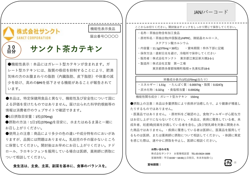 | 表示しようとする機能性 | 本品にはガレート型カテキン、バナバ葉由来コロソリン酸、有胞子性乳酸菌(Weizmannia coagulans SANK70258)が含まれます。ガレート型カテキンには、肥満気味の方のお腹まわりの脂肪(内臓脂肪、皮下脂肪)を低下させ、体重の減少をサポートし、高めのBMIを低下させる機能があることが報告されています。バナバ葉由来コロソリン酸には、健常な方の高めの空腹時血糖値を下げる機能があることが報告されています。有胞子性乳酸菌(W. coagulans SANK70258)は、生きて腸まで届き、腸内環境を整えることで便秘気味の方の便通を改善する機能が報告されています。 |