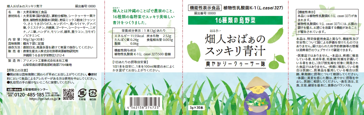 本品は機能性関与成分「植物性乳酸菌K-1(L. casei 327)」を1000億個/日含む食品です。