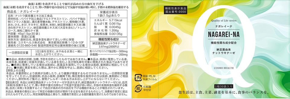 | 表示しようとする機能性 | 本品には納豆菌由来ナットウキナーゼと米紅麹ポリケチドが含まれます。納豆菌由来ナットウキナーゼは、血流(末梢)を改善することで血圧が高めの方の血圧を下げる機能が報告されています。米紅麹ポリケチドは、LDL(悪玉)コレステロールが高めの方のLDL(悪玉)コレステロールを下げて、LDL(悪玉)コレステロール値とHDL(善玉)コレステロール値の比率(L/H比)を下げる機能があることが報告されています。 |