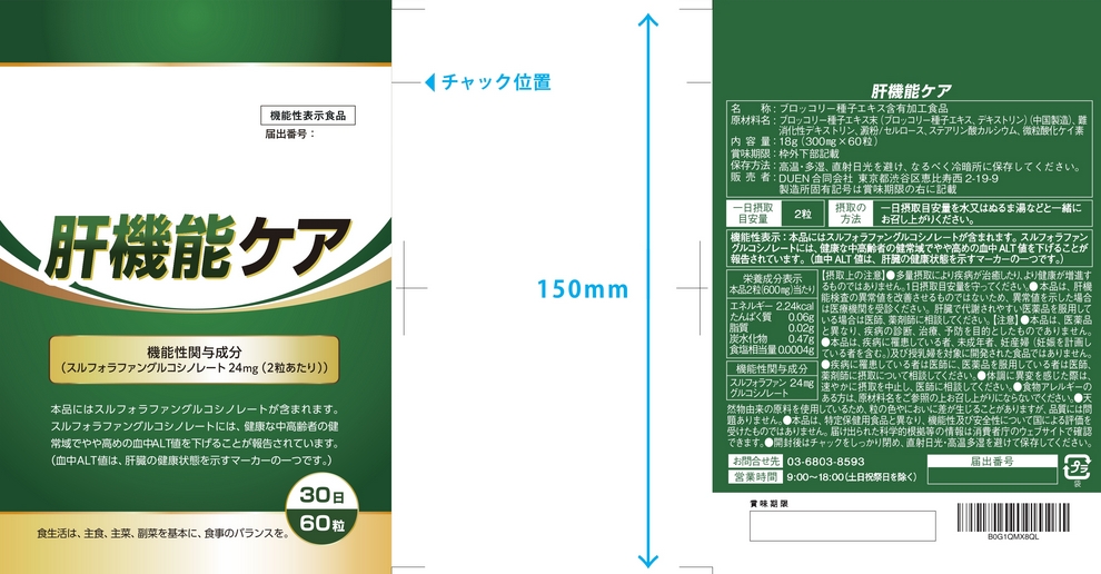 | 表示しようとする機能性 | 本品にはスルフォラファングルコシノレートが含まれます。スルフォラファングルコシノレートを20 mg/日摂取すると肌の乾燥が気になる方の肌の水分量を高める機能、スルフォラファングルコシノレートを24 mg/日摂取すると、健康な中高年世代の方の健常域でやや高めの血中肝機能酵素(ALT)値を低下させる機能が報告されています。 |