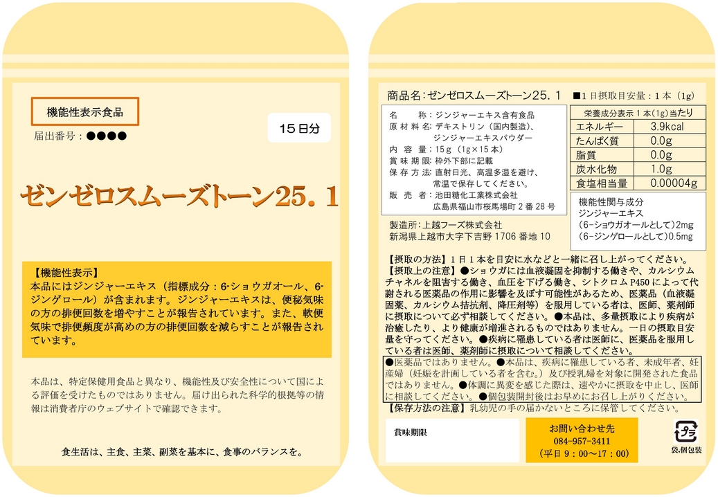 | 表示しようとする機能性 | 本品にはジンジャーエキスが含まれます。ジンジャーエキスは便秘気味の方の排便回数を増やすことが報告されています。 |