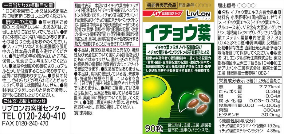 | 表示しようとする機能性 | 本品にはイチョウ葉由来フラボノイド配糖体、イチョウ葉由来テルペンラクトンが含まれます。イチョウ葉由来フラボノイド配糖体、イチョウ葉由来テルペンラクトンは、加齢によって低下した認知機能の一部である記憶力(日常生活で見聞きした言葉や図形などを覚え思い出す力)や判断力(判断の正確さ)を向上させることが報告されています。 |