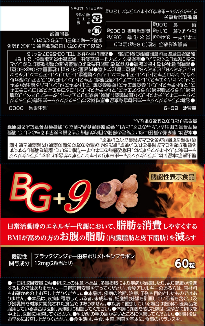 | 表示しようとする機能性 | 本品にはブラックジンジャー由来ポリメトキシフラボンが含まれます。ブラックジンジャー由来ポリメトキシフラボンには日常活動時のエネルギー代謝において、脂肪を消費しやすくする機能、BMIが高めの方の腹部の脂肪を減らす機能、年齢とともに低下する脚の筋力に作用することにより、中高年の方の歩く力を維持する機能が報告されています。 |
