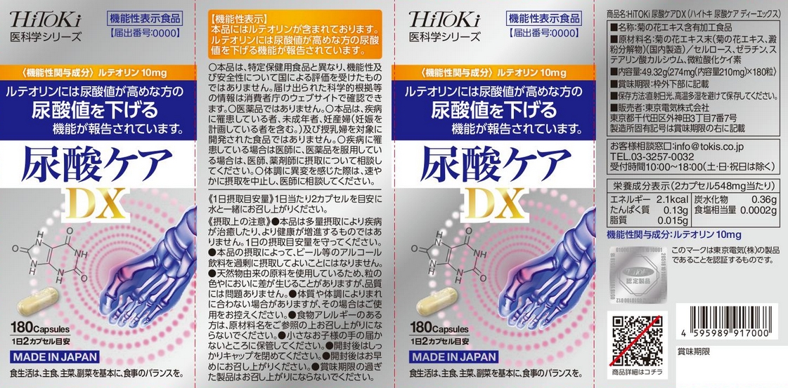 | 表示しようとする機能性 | 本品には、ルテオリンが含まれます。ルテオリンには尿酸値が高め(5.5mg/dL~7.0mg/dL未満)の男性の尿酸値を下げる機能が報告されています。 |