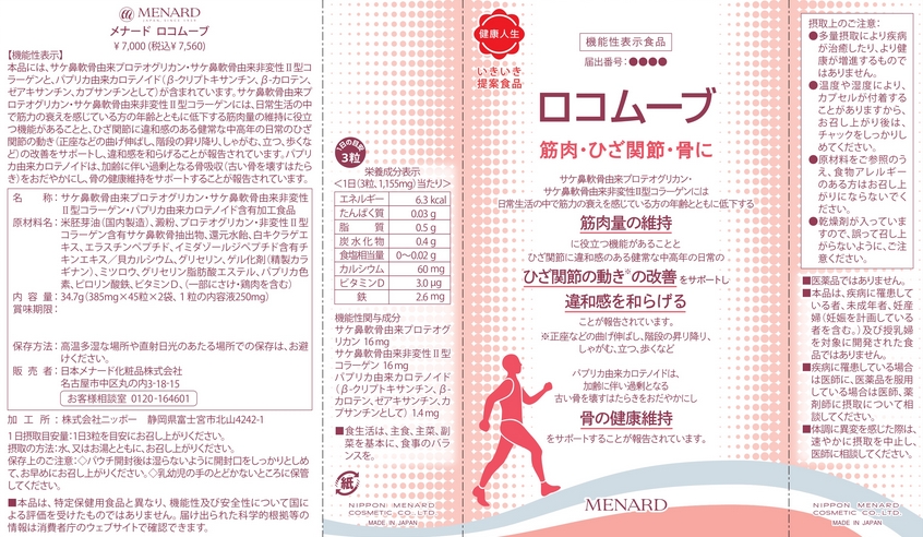 | 表示しようとする機能性 | 本品にはサケ鼻軟骨由来プロテオグリカンが含まれます。サケ鼻軟骨由来プロテオグリカンには、肌弾力を維持し、肌の健康に役立つ機能があることが報告されています。また、膝関節の不快感を持つ中高年の膝の曲げ伸ばしの改善に役立ち、階段昇降、立つ、座る、歩行における膝関節の悩みを改善することが報告されています。 |