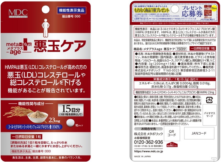 | 表示しようとする機能性 | 本品には3-(4-ヒドロキシ-3-メトキシフェニル)プロピオン酸 (HMPA)が含まれます。3-(4-ヒドロキシ-3-メトキシフェニル)プロピオン酸 (HMPA)は、BMIが高めの方の腹部の脂肪(内臓脂肪)とウエスト周囲径を減らす機能が報告されています。また、食後血糖値が高めの方の食後に上昇する血糖値を元に戻しやすくするのをサポートする機能が報告されています。 |