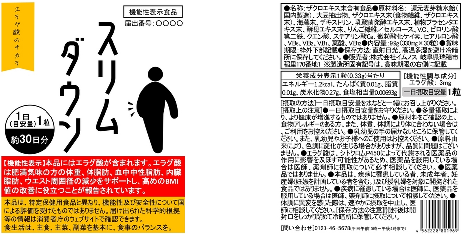 表示しようとする機能性 本品にはエラグ酸が含まれます。エラグ酸は肥満気味の方の体重、体脂肪、血中中性脂肪、内臓脂肪、ウエスト周囲径の減少をサポートし、高めのBMI値の改善に役立つことが報告されています。
