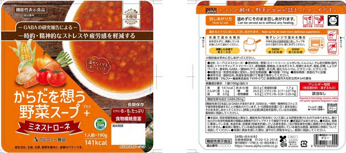 | 表示しようとする機能性 | 本品にはGABAが含まれます。GABAには、日常の身体活動により中高年の方の加齢に伴い低下する筋肉量を維持する機能が報告されています。 |