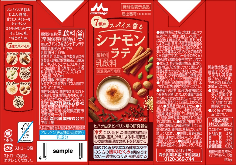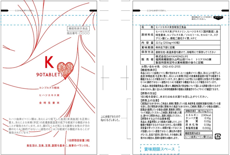 | 表示しようとする機能性 | 本品にはヒハツ由来ピペリン類が含まれます。ヒハツ由来ピペリン類は、冷えにより低下した血流(末梢血流)を正常に整え、冷えによる末梢(手足)の皮膚表面温度の低下を軽減する機能があることが報告されています。また、脚のむくみが気になる健常な女性の夕方の脚のむくみ(病的ではない一過性のむくみ)を軽減する機能があることが報告されています。 |