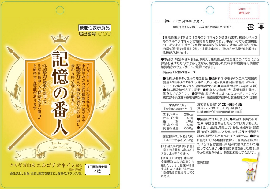 | 表示しようとする機能性 | 本品にはエルゴチオネインが含まれます。エルゴチオネインを25 mg/日摂取すると肌が乾燥しがちな方の肌のうるおいを保つことが報告されています。 |
