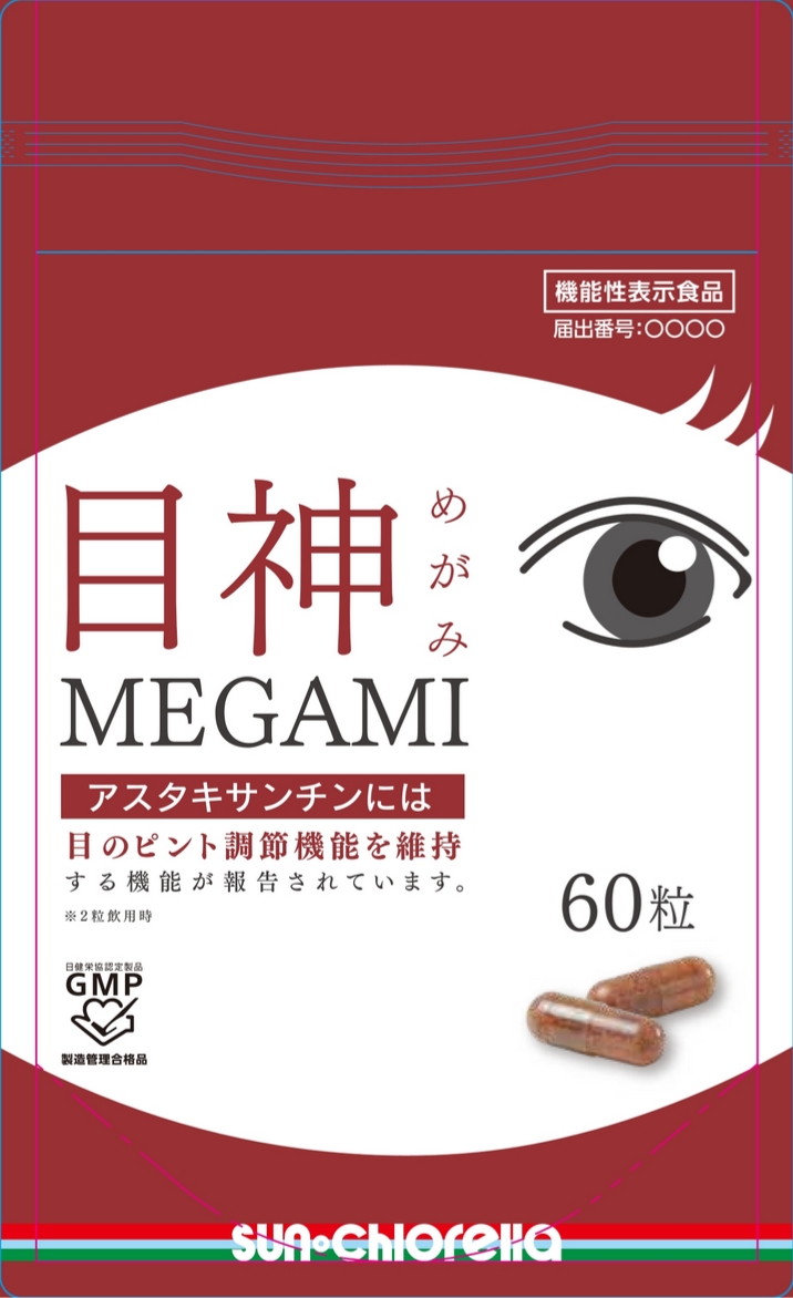 | 表示しようとする機能性 | 本品にはアスタキサンチンが含まれます。アスタキサンチンにはパソコンやスマートフォン、電子ゲームなどのVDT作業における中高年の方の視力の維持をサポートする機能が報告されています。※目の屈折異常を改善するものではありません。 |