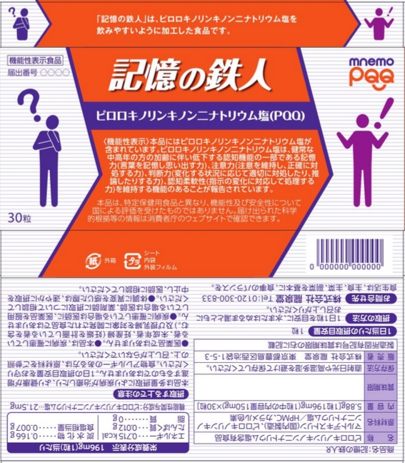 | 表示しようとする機能性 | 本品にはピロロキノリンキノン二ナトリウム塩が含まれます。ピロロキノリンキノン二ナトリウム塩には、健康な中高年の加齢にともない低下する認知機能の一部である注意力及びワーキングメモリー(得られた情報を短時間で記憶・認識し、同時に正しく処理し行動に移す能力)の維持に役立つ機能があることが報告されています。 |