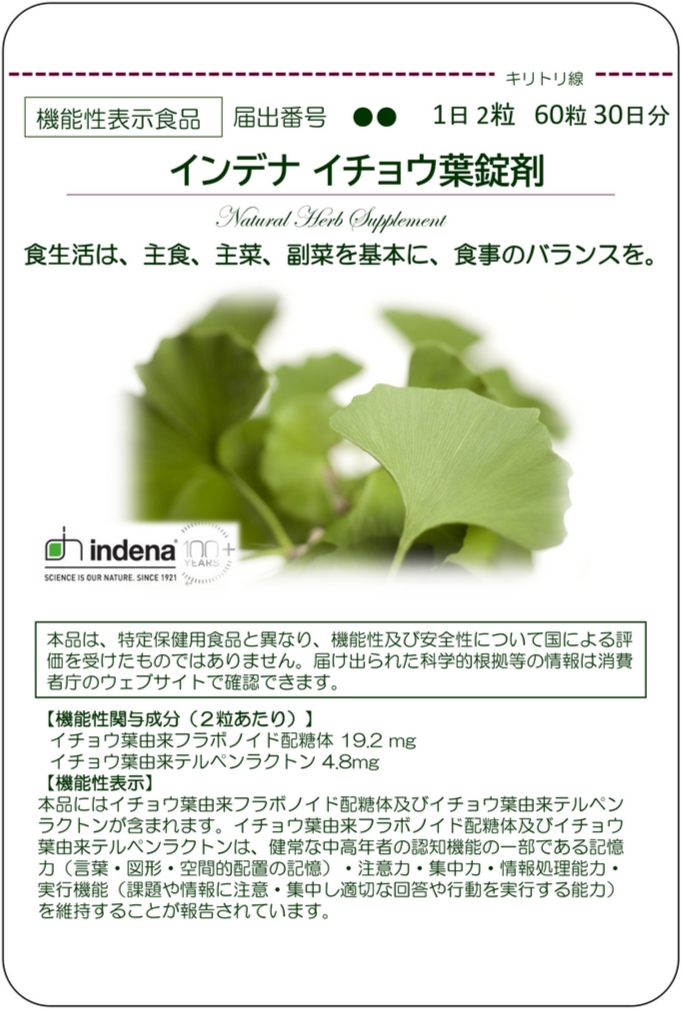 | 機能性関与成分名 | イチョウ葉由来フラボノイド配糖体、 イチョウ葉由来テルペンラクトン |