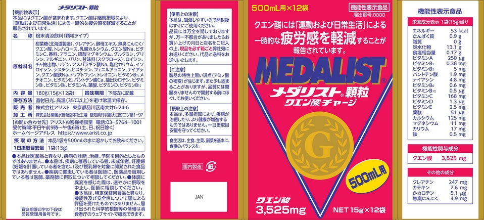 当該製品「メダリストブドウ味」にはクエン酸が1袋15g当り3,525mg含まれ、2,700mg以上含まれます。株式会社アリストでは粉末清涼飲料(顆粒タイプ)のメダリストブドウ味500mL用15gを2020年3月より販売し、2025年5月までの5年間に56万袋以上のクエン酸を主とする粉末清涼飲料を販売してきました。メダリストブドウ味500mL用15gにはクエン酸が3,525mg含まれており、ほとんどがその日のうちに飲まれています。このように当該製品「メダリストブドウ味」は2020年から2025年までの5年間全国各地で販売し、子供から老人まで男女を問わず飲まれてきた実績があり、その間メダリストブドウ味のクエン酸摂取による重大な健康被害は報告されていません。